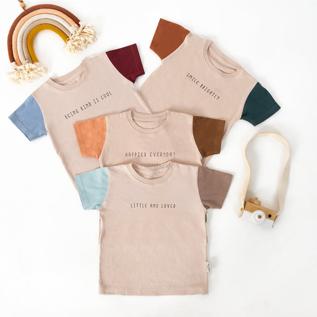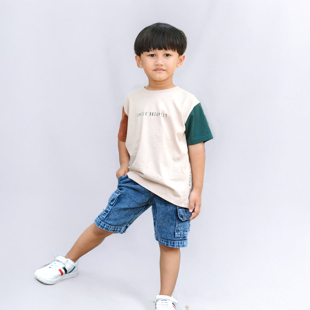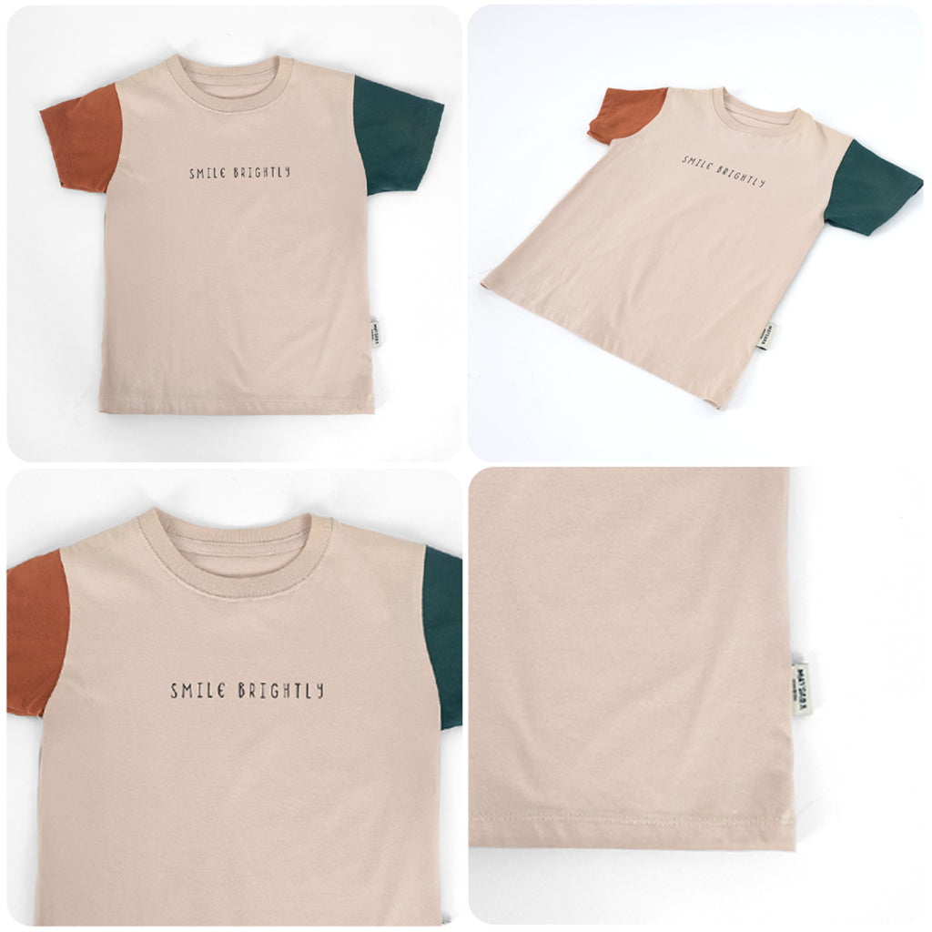 Kaos anak dengan kombinasi 2 warna lengan yang berbeda dan dipadukan menjadi 1