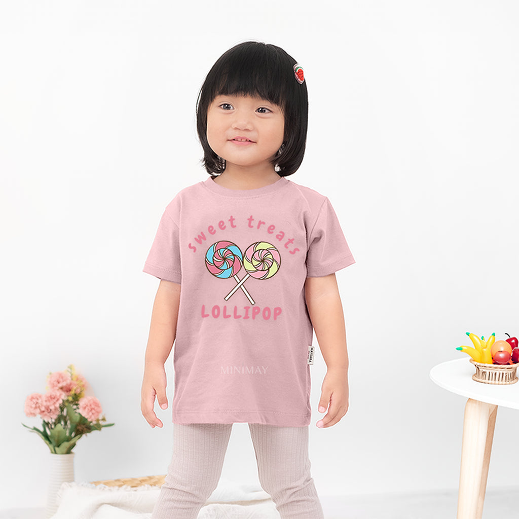 Kaos anak yang didesain dengan dilengkapi aksen sablon ikon candy dan adem digunakan sehari-hari