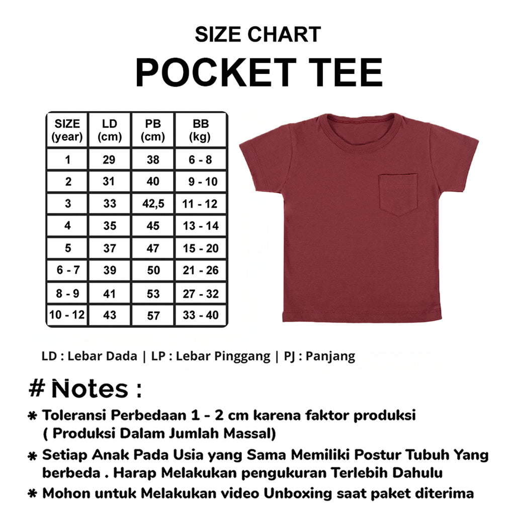 Setiap anak memiliki postur tubuh yg berbeda. Harap melakukan pengukuran dahulu. Jangan jadikan size chart sebagai acuan.