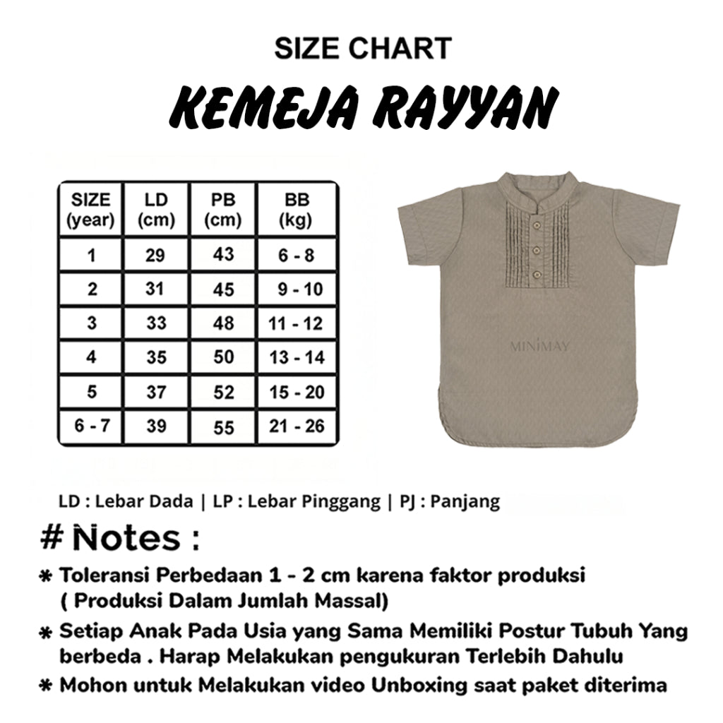 Setiap anak memiliki postur tubuh yg berbeda. Harap melakukan pengukuran dahulu. Jangan jadikan size chart sebagai acuan.