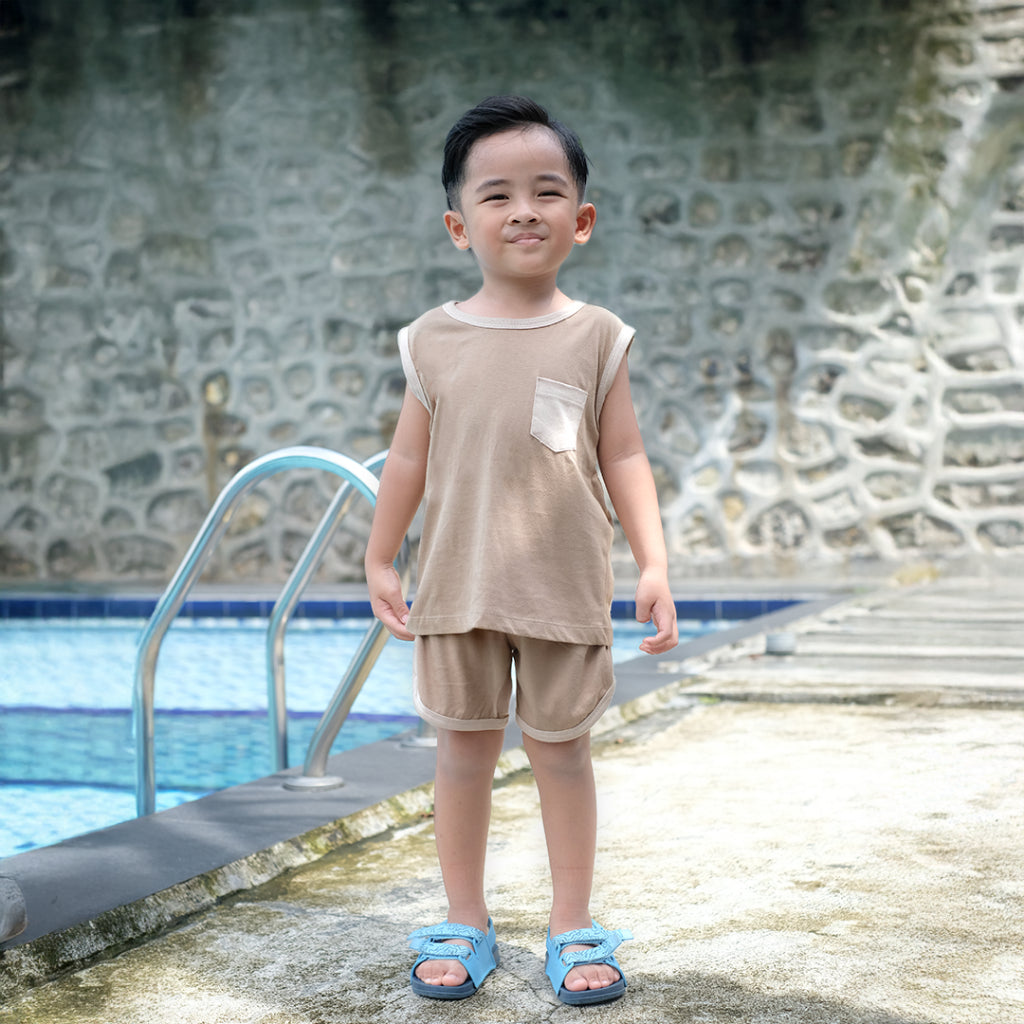 Setelan kaos anak yang dipadukan dengan 2 warna menjadi 1 dan terdapat saku hidup disebelah kiri yang membuat anak semakin kece