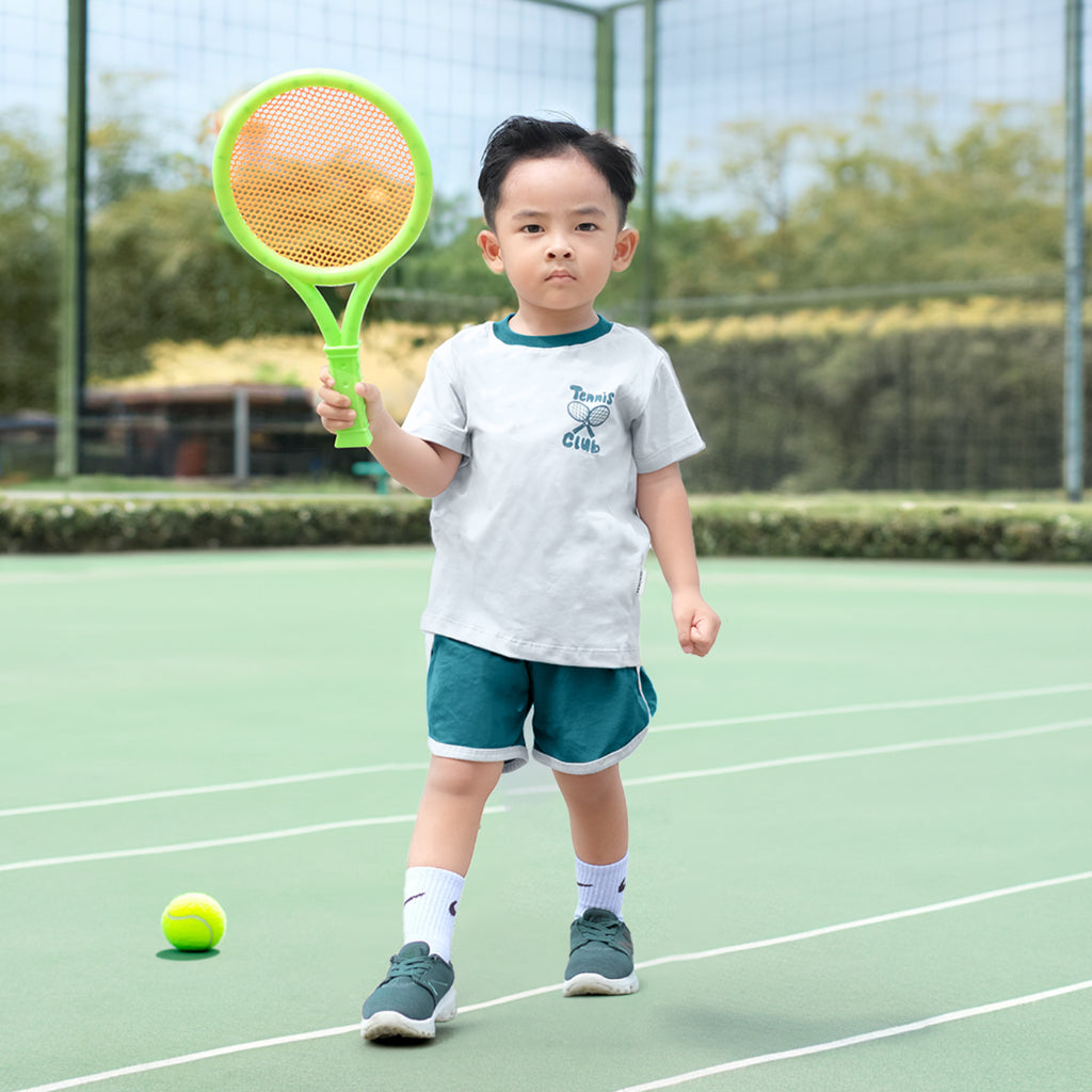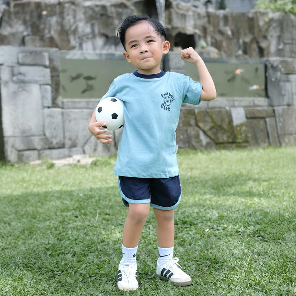 Setelan kaos anak yang didesain dengan dilengkapi dengan ikon olahraga yang membuat anak semakin kece